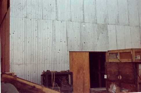 The shrapnel blew across the hanger and up at the same time. It went through the roof of the hanger. The white dots are all shrapnel holes in the roof.