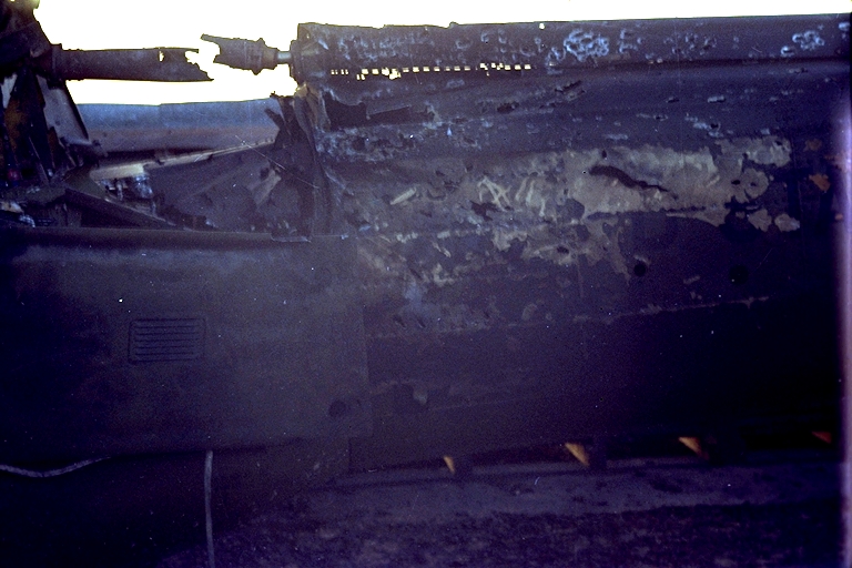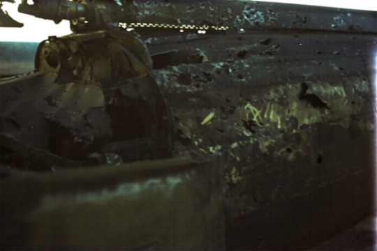 This shot and the next three are what happened after they walked 82 MM mortars up the flight line on Dong Tam ,Dec 23 68, and all were dead center on the tail booms of the ships in their reventments.