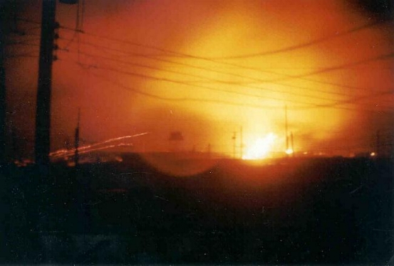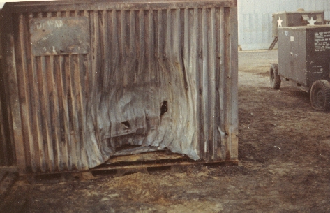 The next round landed directly in front of our Ammo connex. It hit on top of the acetelene tanks we used for welding. They all burst into flames and several were launched across the compond area. The connex contained all of small arms , ammo and grenades that our crew chiefs had for their ships.