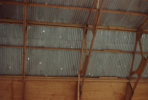The shrapnel blew across the hanger and up at the same time. It went through the roof of the hanger. The white dots are all shrapnel holes in the roof.