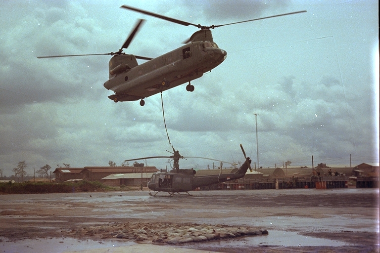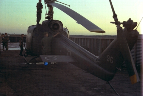 One of our Slicks had a hard landing on a paddy dike. It flew back but we found that it had to be taken to Vung Tau by a Chinook because of main frame damage.